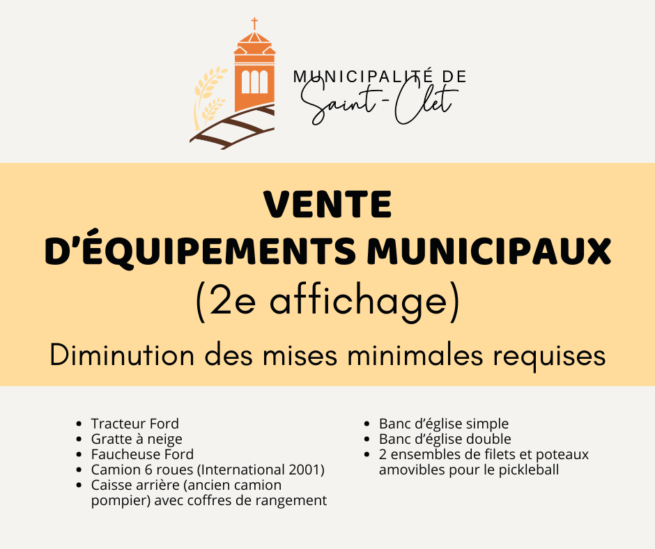 La Municipalité de Saint-Clet souhaite se départir d’équipements usagés. Vous trouverez la liste des équipements usagés en question incluant de courtes descriptions et photos en cliquant sur les items plus bas. Pour une meilleure visualisation des documents, il est préférable d’utiliser un ordinateur.